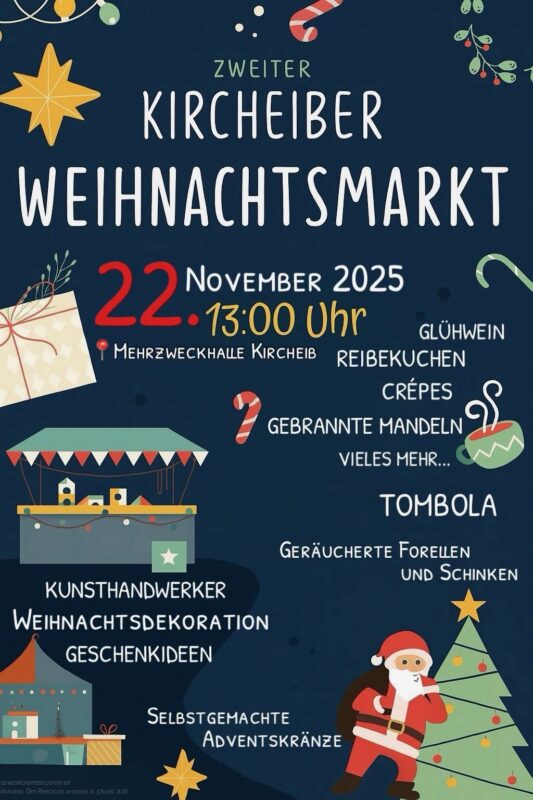 Der Geselligkeitsverein Nachtschwärmer Kircheib e. V. lädt herzlich zum 2. Weihnachtsmarkt an der Mehrzweckhalle in Kircheib ein. Los geht es um 13:00 Uhr, und jeder ist willkommen, mit uns ein paar schöne Stunden in weihnachtlicher Stimmung zu verbringen.
